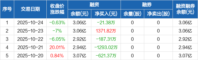 融资方面,当日融资买入1353.24万元,融资偿还1374.62万元,融资净偿还21.38万元。融券方面,融券卖出0股,融券偿还0股,融券余量0股,融券余额0元。融资融券余额合计3.06亿元。