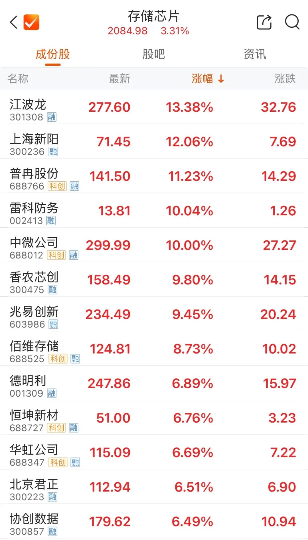 存储芯片概念走强。截至发稿,雷科防务涨停,江波龙涨超13%,上海新阳涨超12%,普冉股份涨超11%,兆易创新涨超9%。