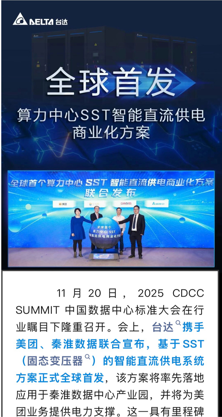 台达与携手美团、秦淮数据联合发布了全球首个算力中心SST智能直流供电系统方案。据了解,该方案将率先落地应用于秦淮数据中心产业园,并将为美团业务提供电力支撑。