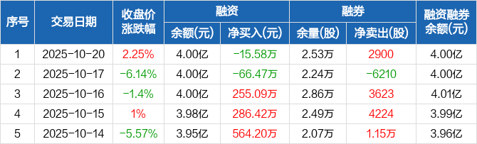 融资方面,当日融资买入1858.72万元,融资偿还1874.3万元,融资净偿还15.58万元。融券方面,融券卖出2900股,融券偿还0股,融券余量2.53万股,融券余额69.94万元。融资融券余额合计4亿元。