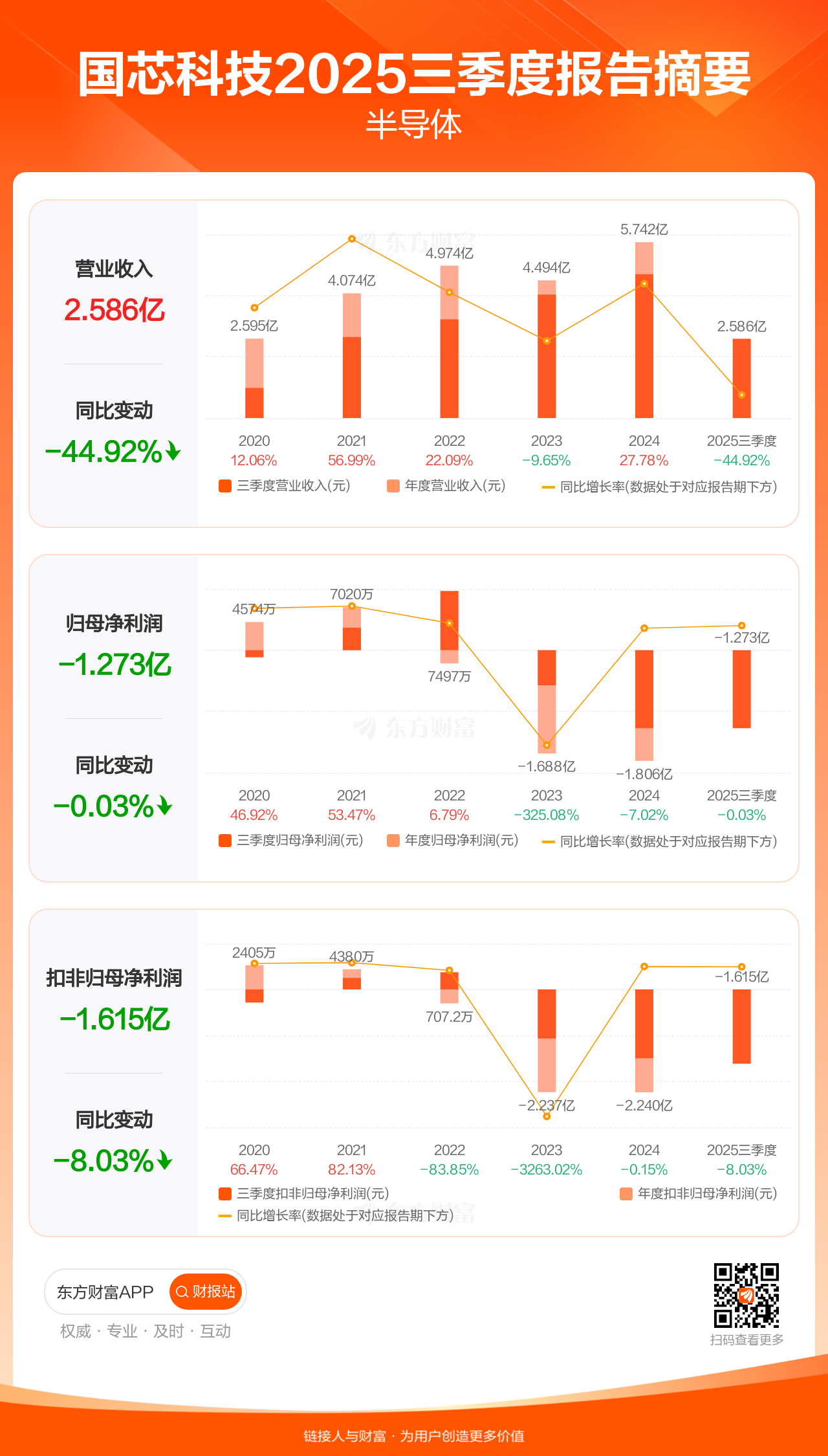 国芯科技10月29日发布2025年三季报显示,公司前三季实现营业收入2.59亿元,同比下滑44.92%;归母净利润-1.27亿元;扣非归母净利润-1.61亿元。