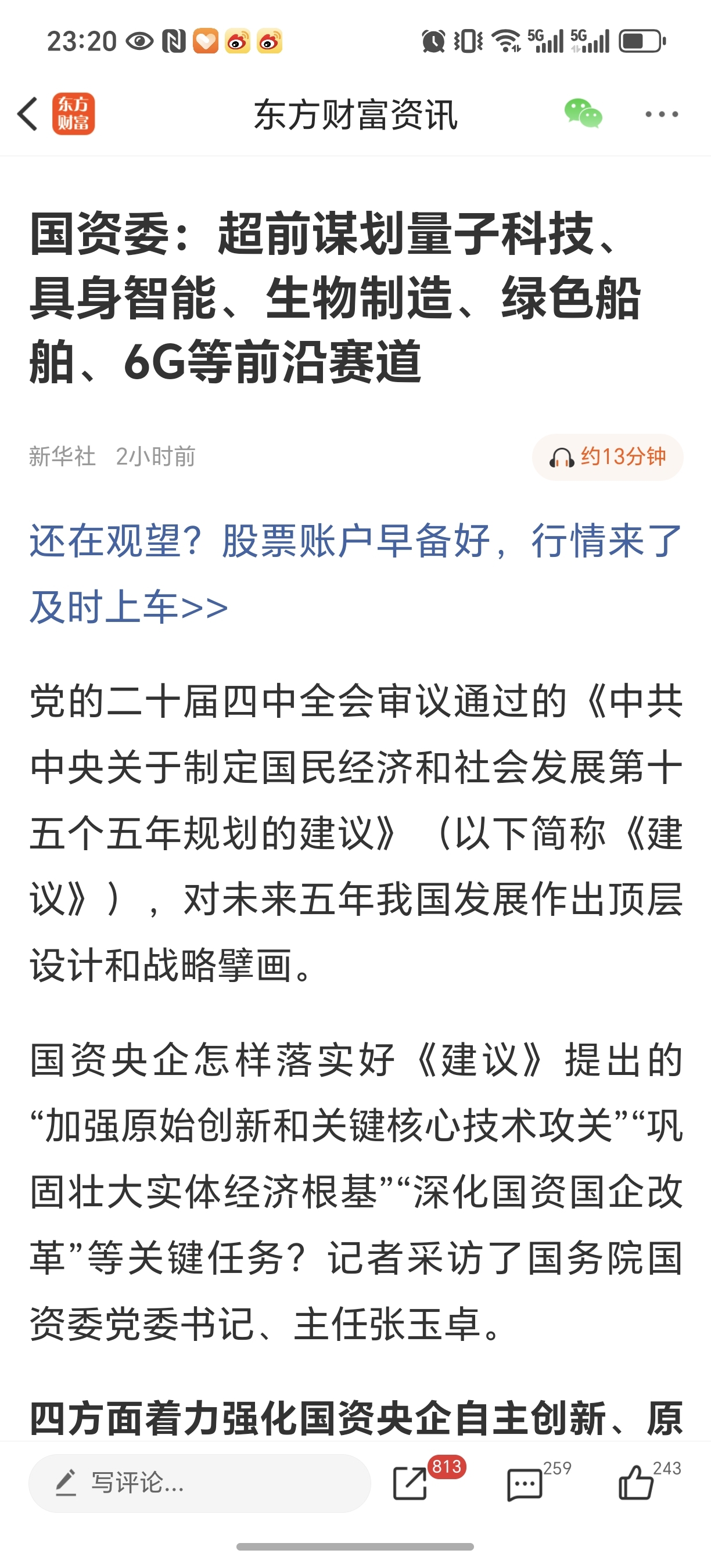 $国芯科技(SH688262)$ 国资委:超前谋划量子科技、具身智能、生物制造、绿色船舶、6G等前沿赛道