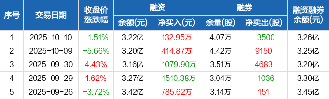 融资方面,当日融资买入2027.81万元,融资偿还1894.86万元,融资净买入132.95万元。融券方面,融券卖出0股,融券偿还3500股,融券余量4.07万股,融券余额427.46万元。融资融券余额合计3.26亿元。