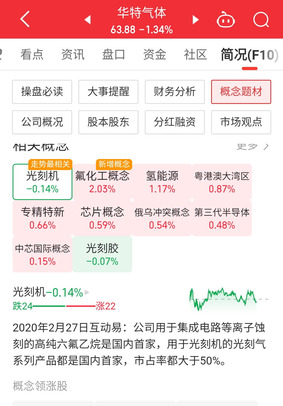 $华特气体(SH688268)$ 华特气体用于集成电路等离子蚀刻的高纯六氟乙烷是国内首家,用于国内光刻机的光刻气体系列产品都是国内首家,市占率超过50%,华特是光刻机、芯片气体的真正龙头企业。