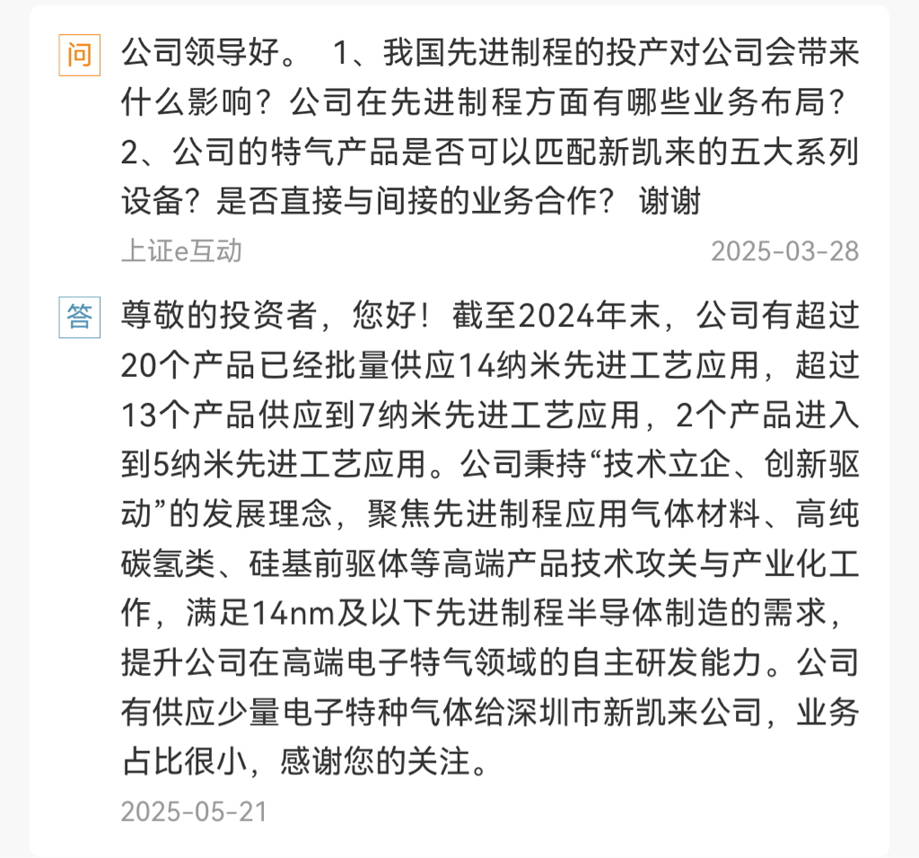 $华特气体(SH688268)$ 董秘:少量特种气体供应新凯来。5月的信息被遗忘了吗?