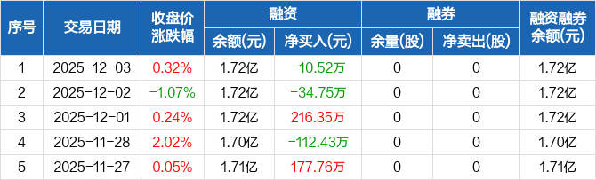 凯立新材:融资净偿还10.52万元,融资余额1.72亿元(12-03)