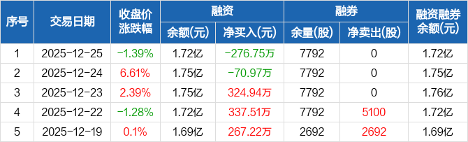 凯立新材:融资净偿还276.75万元,融资余额1.72亿元(12-25)
