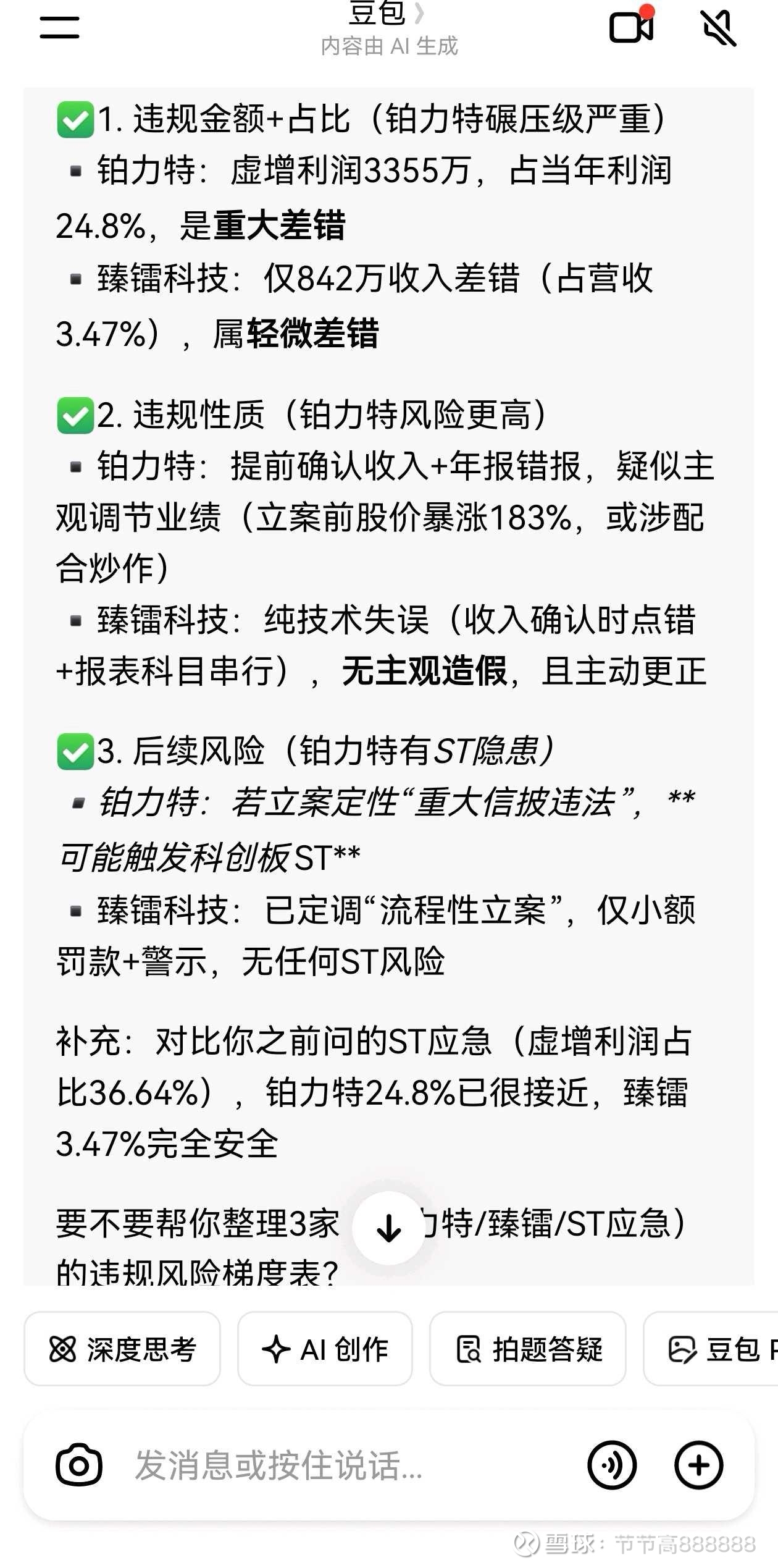 作为投资者,在看到利空信息的时候,要认真了解和分析,有的人每天在股市里杀进杀出,一天N个W的亏损和盈利,但却不愿意去多了解一下自己投资方股票的真实情况。前几天我看到臻镭科技立案调查的公告后,虽然我当时并未持有,但我随即就打电话去公司了解这个立案调查的性质和情况,公司明确回复只是一个几百万的会计差错,而且是公司主动上报的。那么很明显,这种情况并不会导致臻镭科技ST,有的人期望它能ST,但你了解下规则确实是不会ST啊,ST之后资金更好做盘,像ST铖昌就走得很牛,不过确实是不会被ST啊,机构也是知道的。这些都是公开信息,你有心就能去了解到,有些人做投资亏了那么多钱,却不愿意花两毛钱去打个电话问问。这几天股价调整也是预期内的,因为市场总是有信息差的,总是有那么些不认真研究的人要恐慌出逃,总是有些人要吓一吓不明真相的散户,总是有一些对风险极度敏感的资金要保守处理,总是有获利盘要砸盘跑路。但风波过后,我们再来看臻镭科技,已经落后板块龙头三十个点的涨幅。周末立案的另外一只商业航天,性质和严重程度也许并不相同(要更严重,存在ST风险),我们要分开来看待。