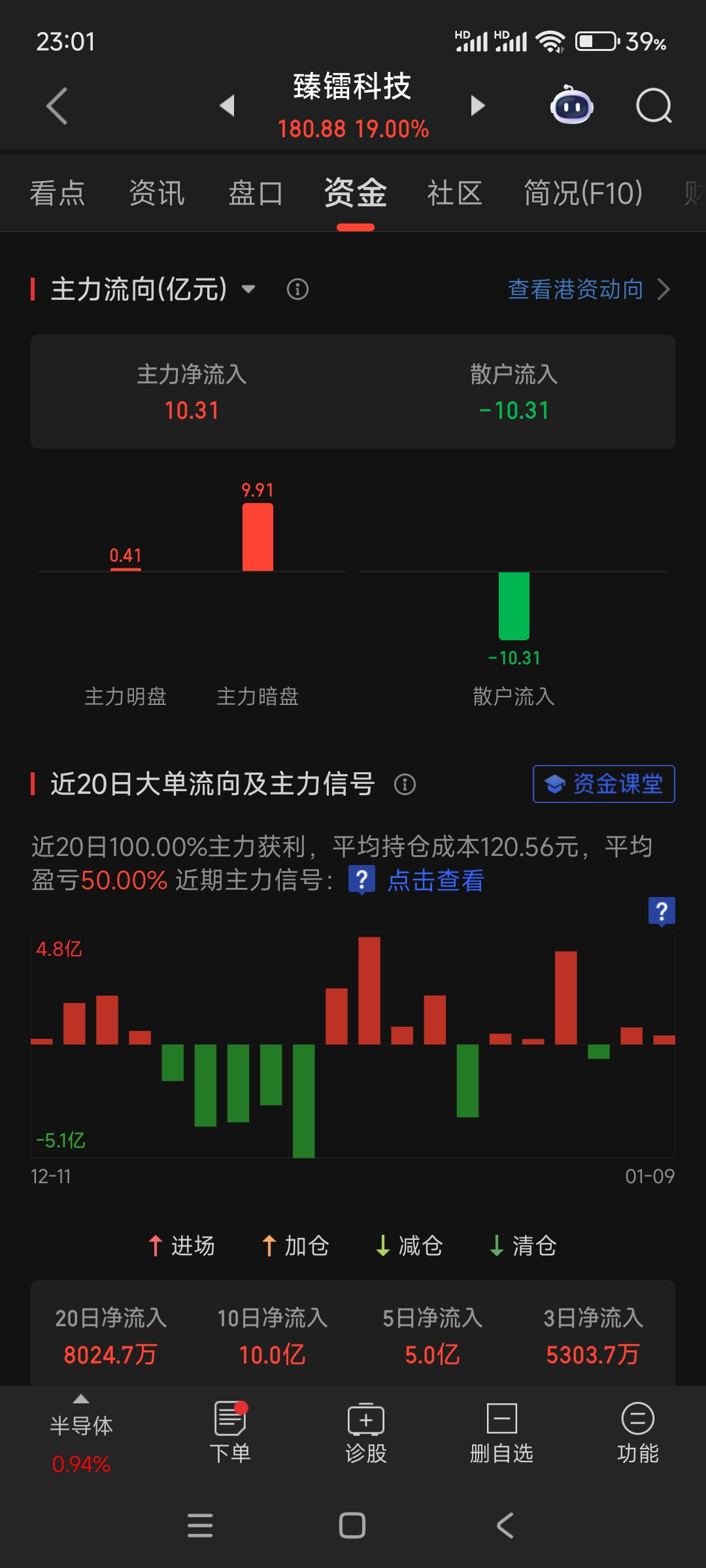 $臻镭科技(SH688270)$ 主力净流入10.31亿元,其中暗盘资金净流入 9.91亿元。主力控盘比例达到近期最高64.94%,已高度控盘。散户变化 -1097.24,散户数量很少了。