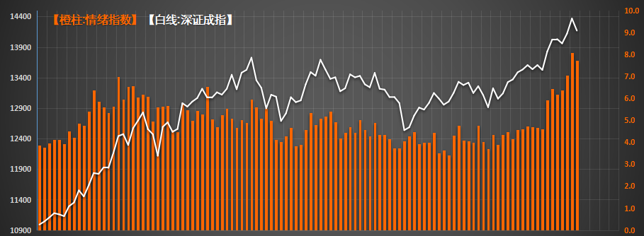 大盘的情绪也稳步上升,今天创造了新的历史记录,超过了2024年10月8日的7.84。