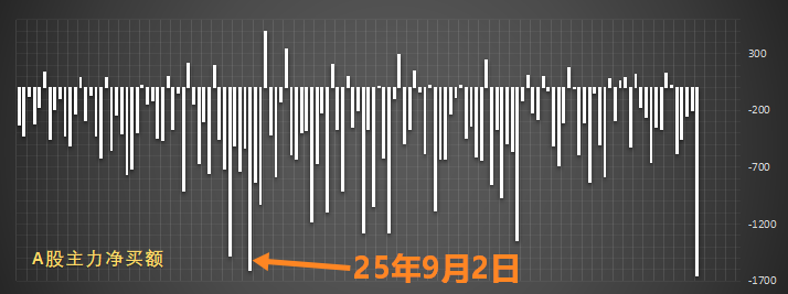 今天,A股放量大跌,成交量有创出3.7万亿的天量,主力资金净流出1655亿,仅次于24年10月9日,比最近一次25年9月2日的还多出51亿,明天抛压将减轻;