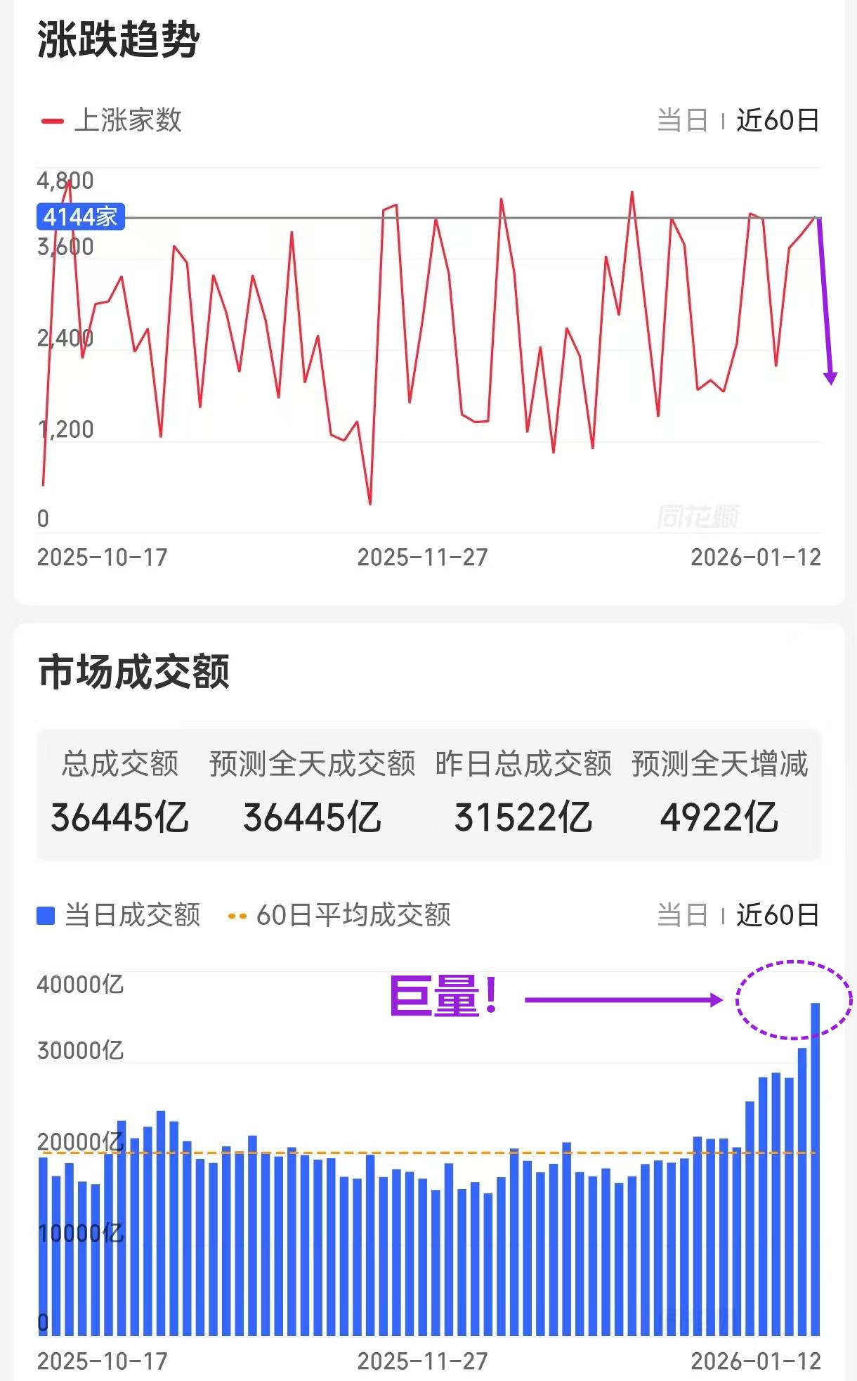 新年伊始的行情有点疯狂,自5日开始上涨股票数量平均达到了3707只(最低一天也有2173只),不仅如此,成交量也稳步放大,今天创造了3.645万亿新纪录!