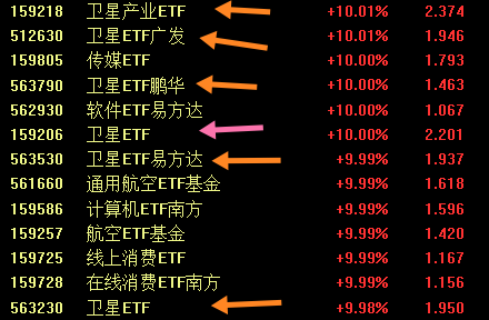 不仅个股疯狂,就连基金也不例外,与卫星有关的基金全部涨停,资金借助基金流入成分股,成分股势必也将水涨船高。
