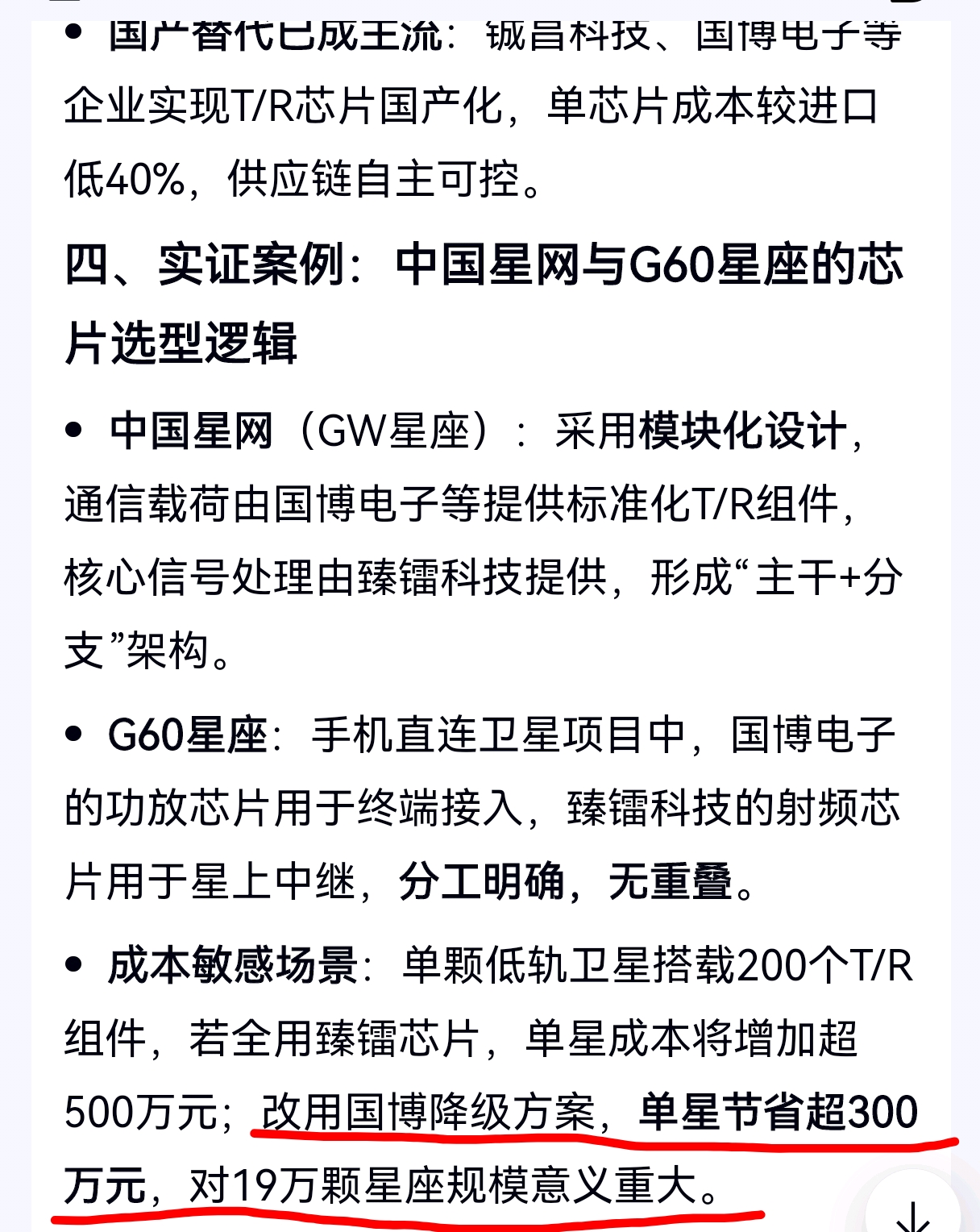 $臻镭科技(SH688270)$ 中电科旗下的国博电子近水楼台:单颗低轨卫星搭载200个T/R组件,若全用臻镭芯片,单星成本将增加超500万元;改用国博降级方案,单星节省超300万元,对19万颗星座规模意义重大。商业航天的胜利,不是谁的芯片性能更强,而是谁的系统更便宜、更快、更稳。建议平铺两条腿走路