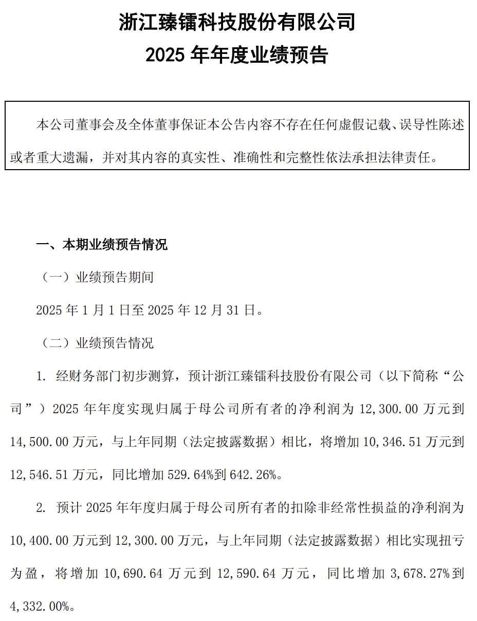 1月27日晚间,臻镭科技发布2025年年度业绩预告,预计2025年实现归属于母公司所有者的净利润为1.23亿元到1.45亿元,与上年同期(法定披露数据)相比,将增加1.03亿元到1.25亿元,同比增加529.64%到642.26%;归属于母公司所有者的扣除非经常性损益的净利润为1.04亿元到1.23亿元,与上年同期(法定披露数据)相比实现扭亏为盈,将增加1.07亿元到1.26亿元,同比增加3678.27%到4332.00%。
