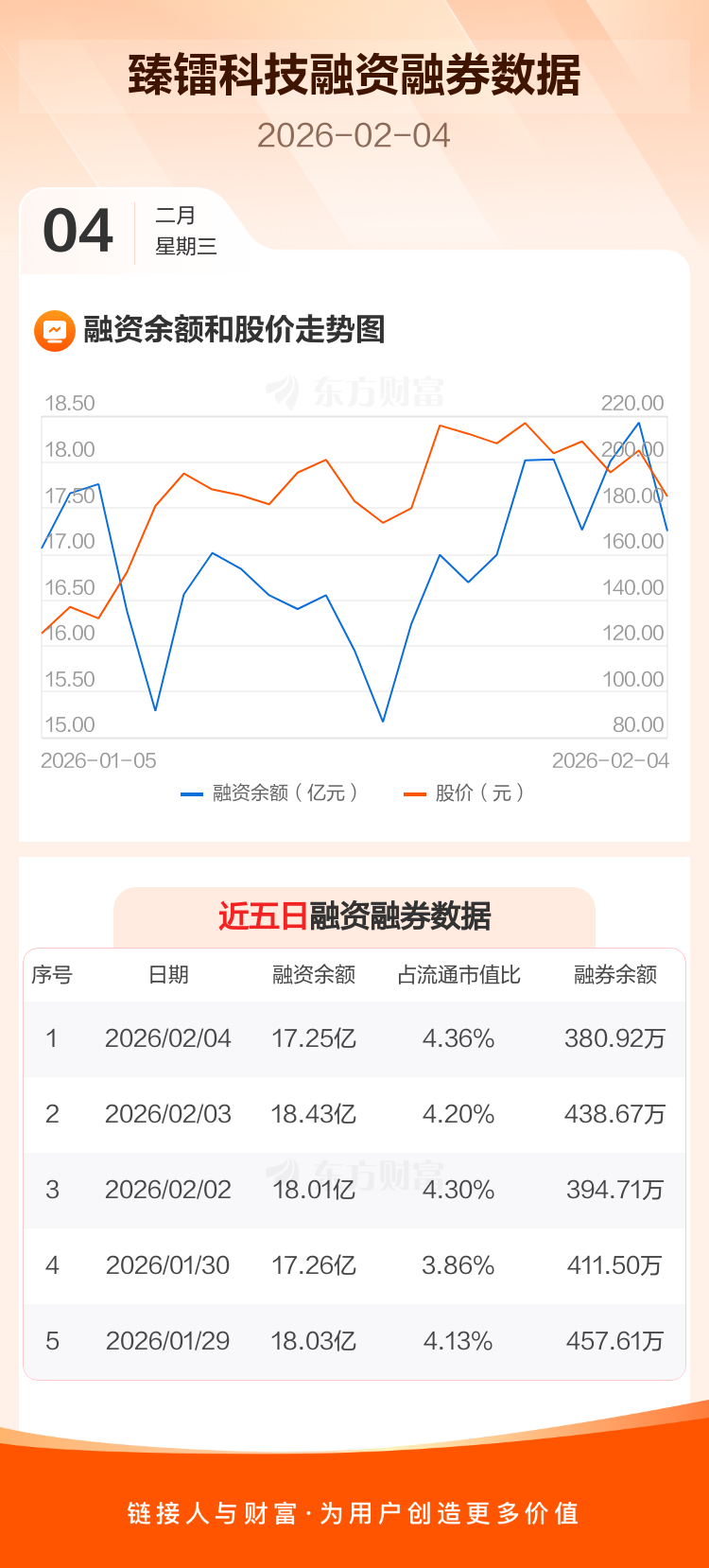 交易所最新数据显示,臻镭科技于2026年2月4日获融资买入3.10亿元,融资偿还4.28亿元,当日融资净偿还1.18亿元。目前,该股融资余额17.25亿,占流通市值比例为4.36%。