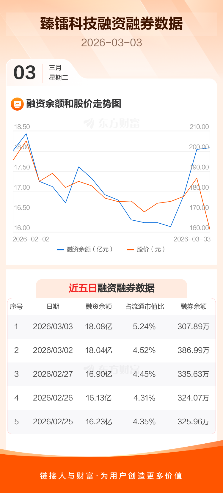 交易所最新数据显示,臻镭科技于2026年3月3日获融资买入3.39亿元,融资偿还3.35亿元,当日融资净买入352.56万元。目前,该股融资余额18.08亿,占流通市值比例为5.24%。