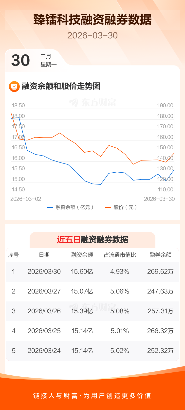 交易所最新数据显示,臻镭科技于2026年3月30日获融资买入2.15亿元,融资偿还1.62亿元,当日融资净买入5306.91万元。目前,该股融资余额15.60亿,占流通市值比例为4.93%。