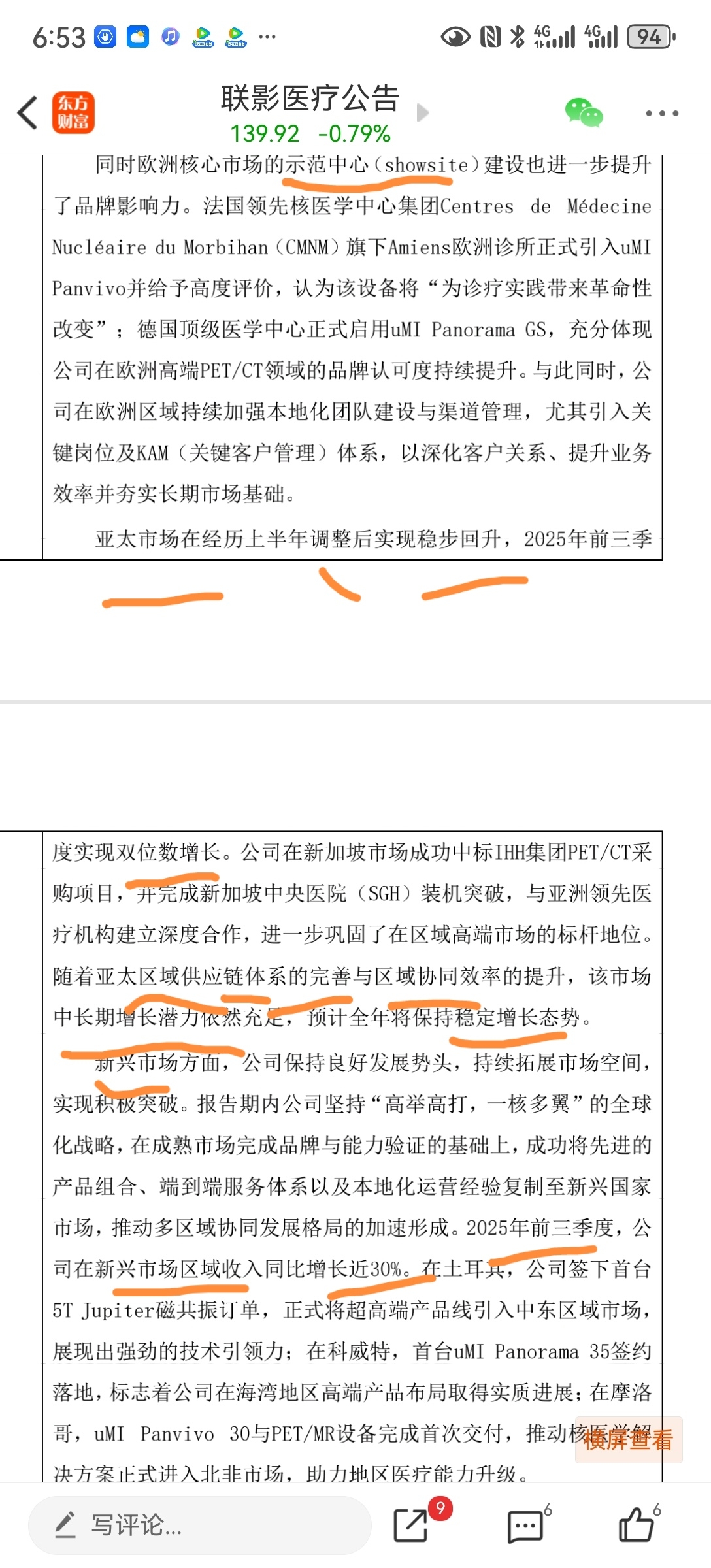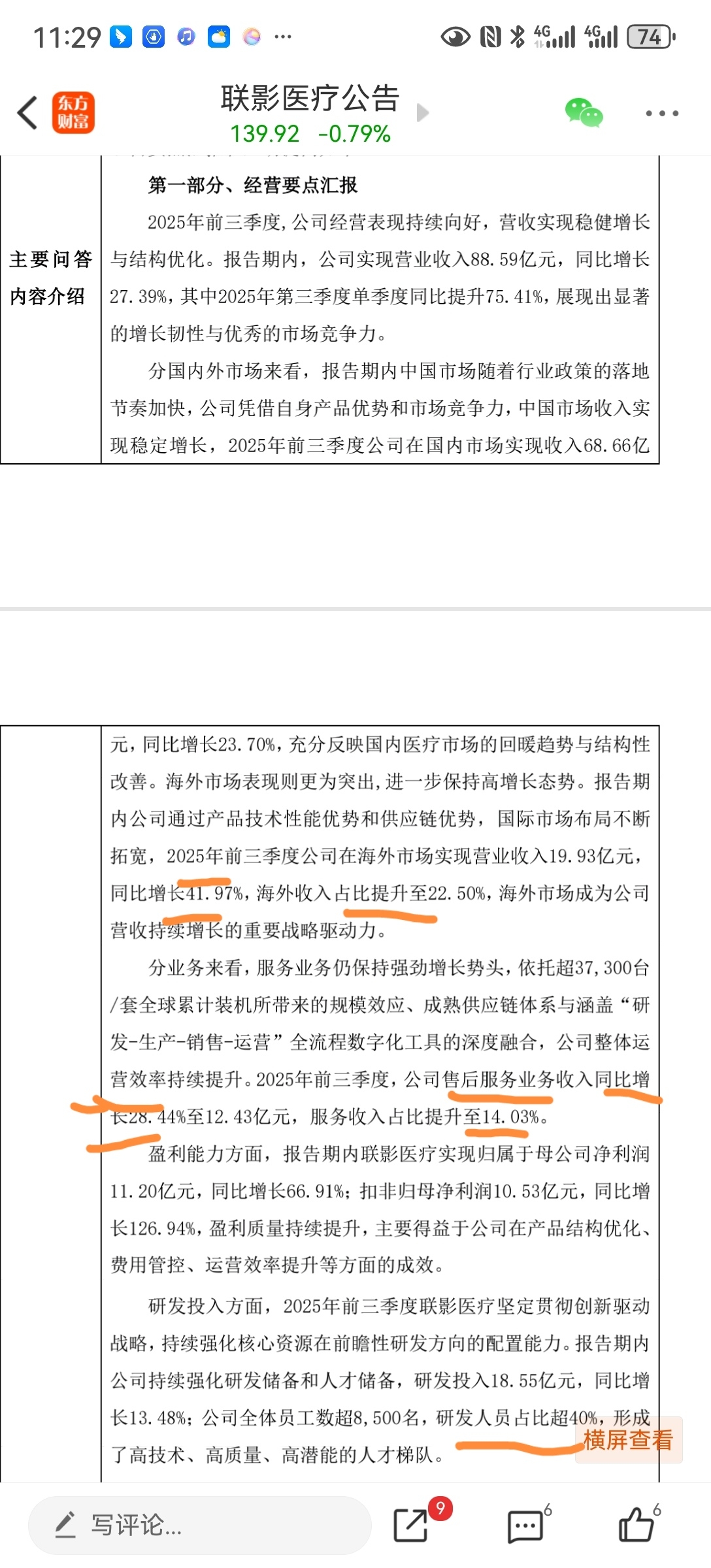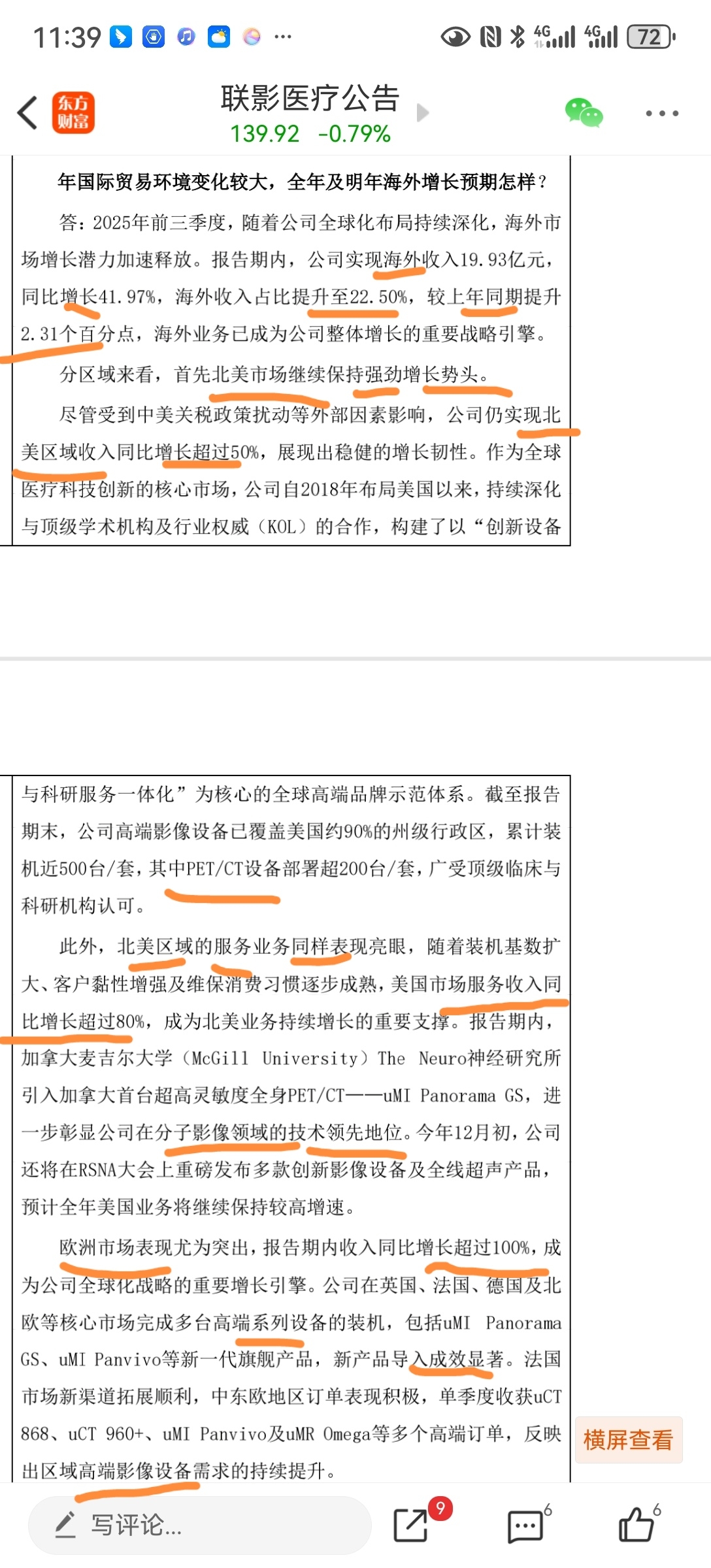 $联影医疗(SH688271)$ 联影医疗海外业绩增长41%,营收占比提升到22.5%,其中北美增长50%(其中售后服务业增长80%),欧洲100%以上,亚太调整后稳步回升,新兴市场增长30%,下半年订单集中落地,订单向收入转换率进一步提升。 国内外售后服务业增长28%,占营收提升到14%!