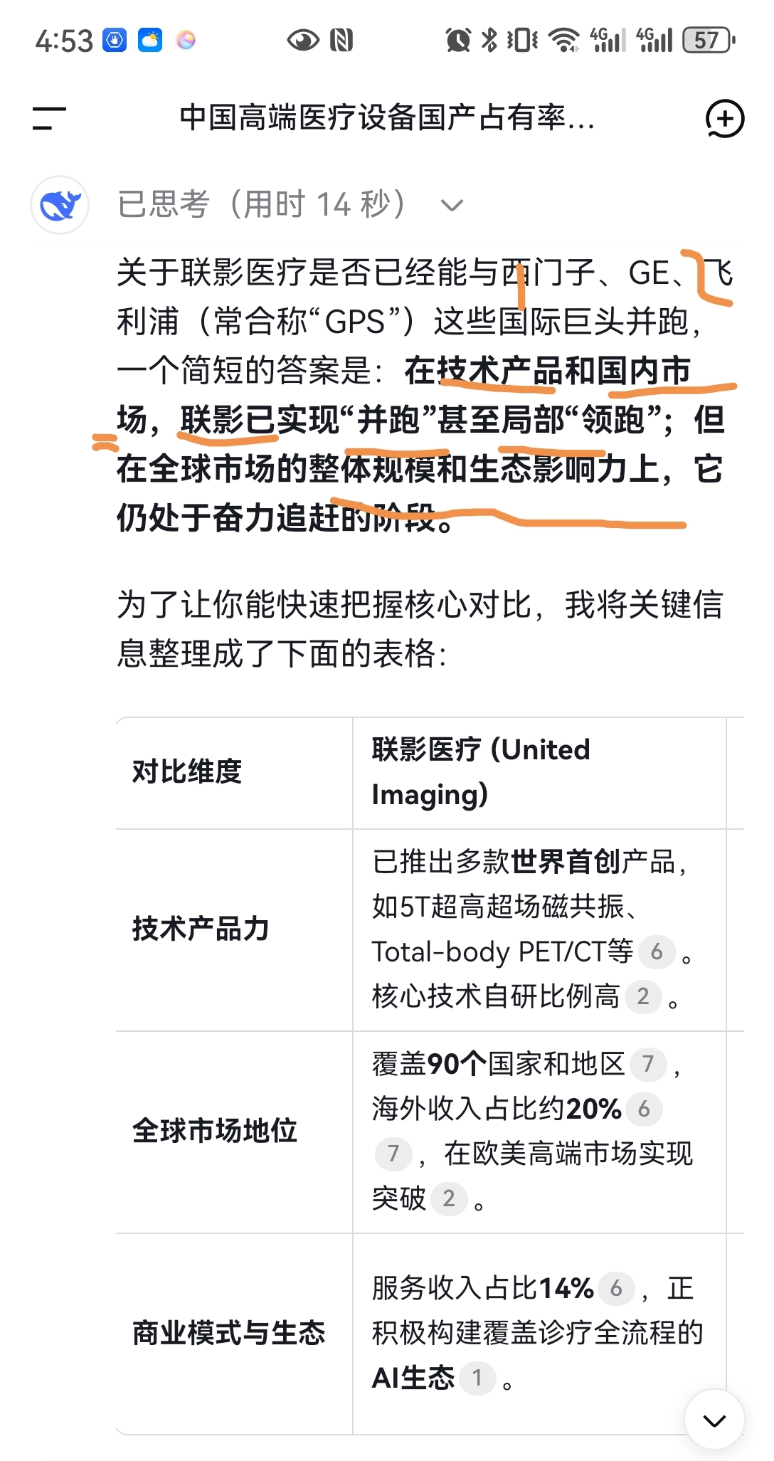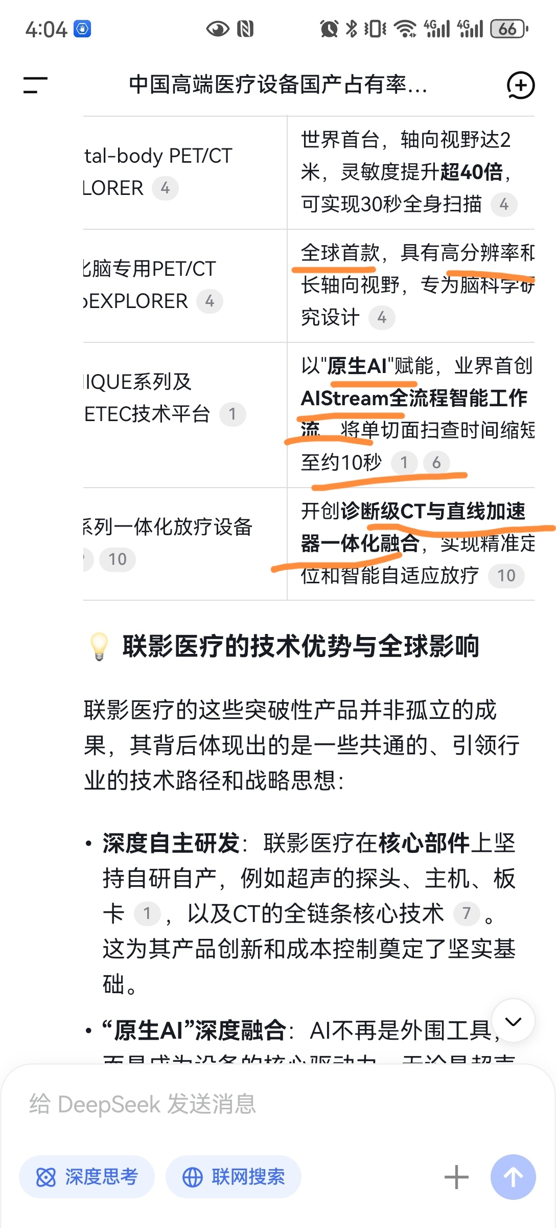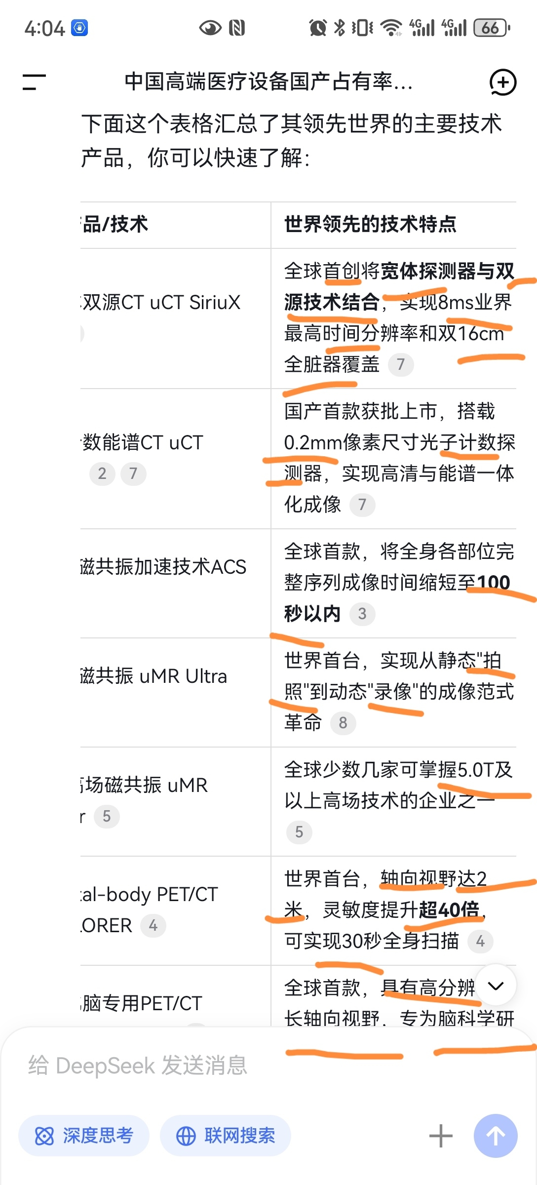 $联影医疗(SH688271)$ 联影医疗在技术产品和国内市场上已实现并跑有些甚至领跑。 联影医疗全球领先的技术有:1、ct有2种:双宽体双源ct、光源计数能普ct;2、mr有三种:秒级磁共振加速技术、“摄像”磁共振、5t磁共振;3、petct两种:2米全身petct、脑专用petct 4、超声一个系列中的高端;5、RT放射治疗(ct+直线加速器
