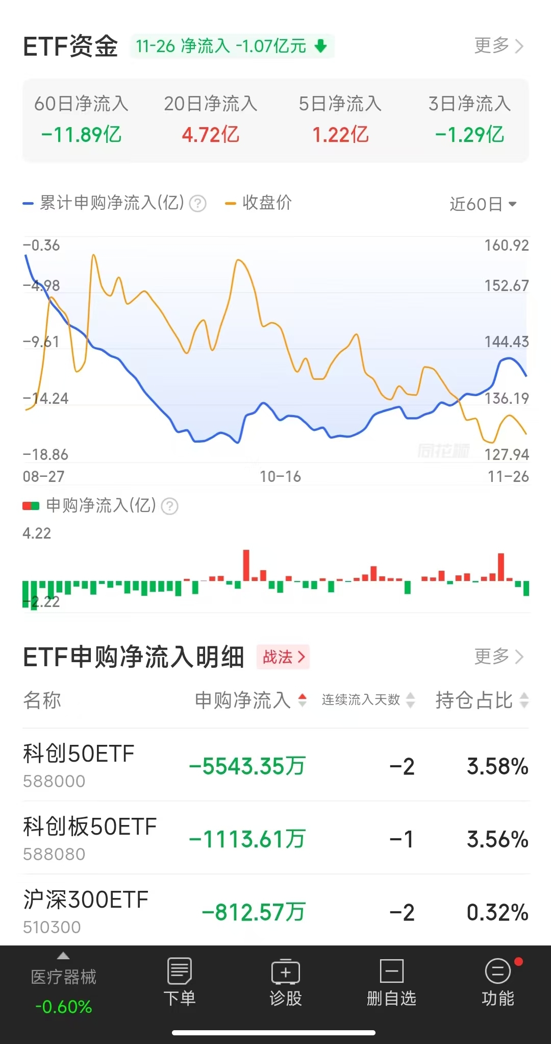 昨天ETF基金净卖出1个亿,成交量才4个多亿,哎