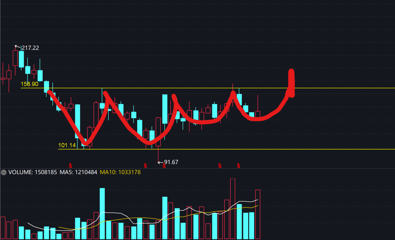 月线箱体震荡中间位置不上不下,突破160才算走个上升趋势