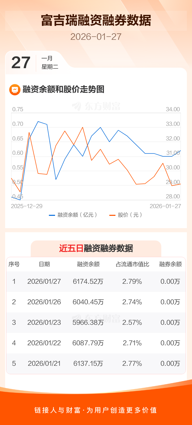 交易所最新数据显示,富吉瑞于2026年1月27日获融资买入583.54万元,融资偿还449.47万元,当日融资净买入134.07万元。目前,该股融资余额6174.52万,占流通市值比例为2.79%。