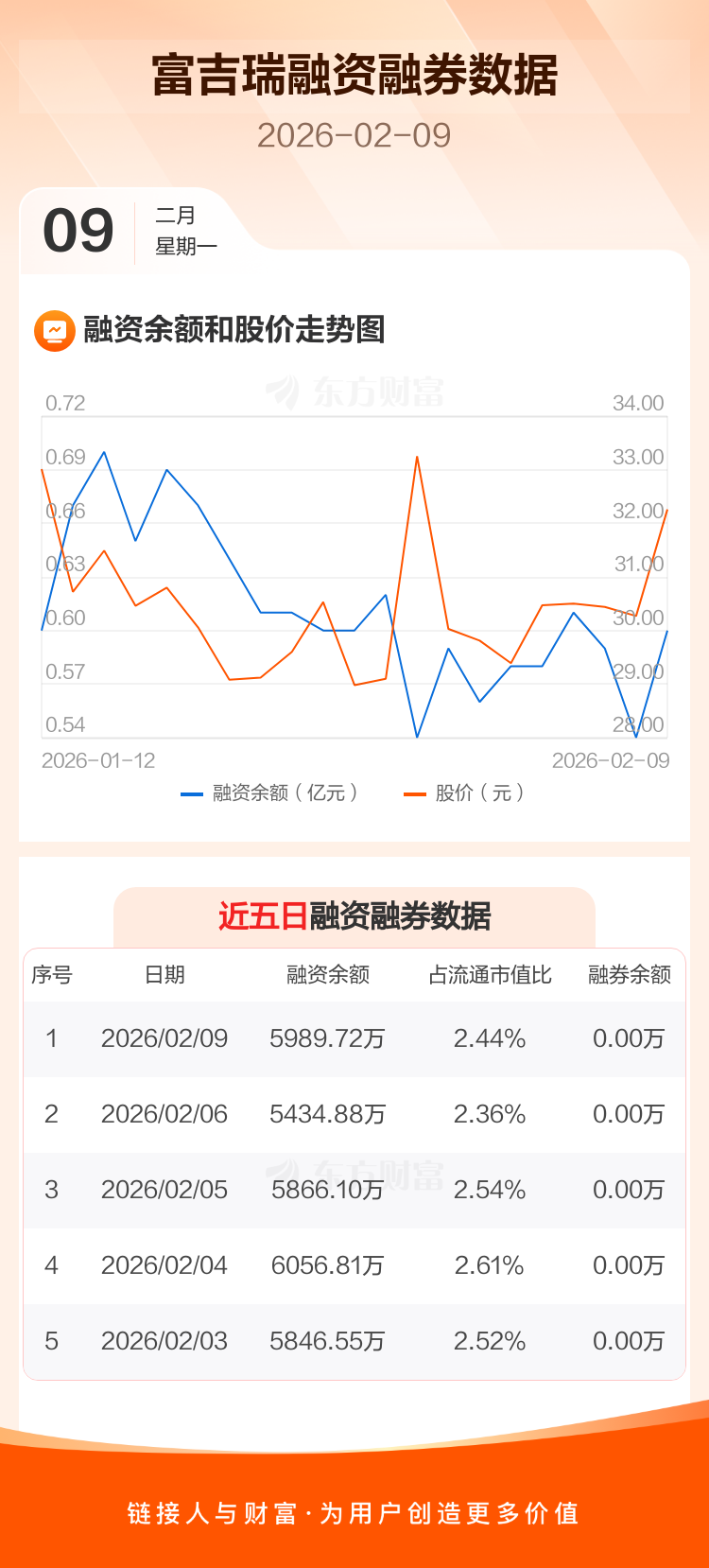 交易所最新数据显示,富吉瑞于2026年2月9日获融资买入915.08万元,融资偿还360.24万元,当日融资净买入554.84万元。目前,该股融资余额5989.72万,占流通市值比例为2.44%。