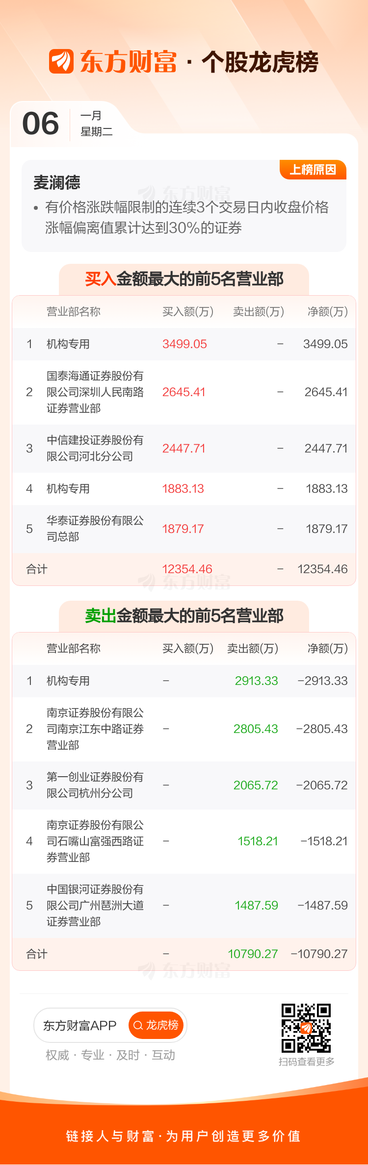 交易所2026年1月6日公布的交易公开信息显示,麦澜德因成为有价格涨跌幅限制的日收盘价格涨幅达到15%的前五只证券、有价格涨跌幅限制的连续3个交易日内收盘价格涨幅偏离值累计达到30%的证券上榜。麦澜德当日收报61.22元,涨跌幅19.99%,偏离值19.99%,换手率29.02%,成交额6.31亿。异常期间1月5日至1月6日,期间涨幅43.98%,累计偏离值37.65%,区间成交额9.83亿。
