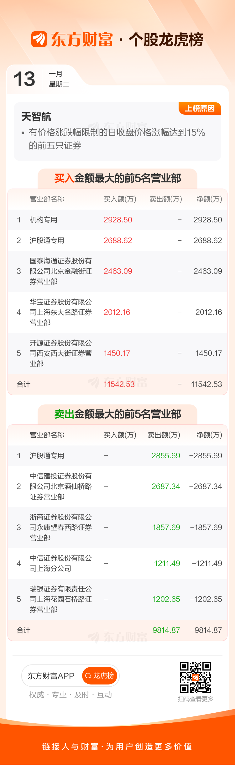 交易所2026年1月13日公布的交易公开信息显示,天智航因成为有价格涨跌幅限制的日收盘价格涨幅达到15%的前五只证券上榜。天智航当日收报22.03元,涨跌幅16.62%,偏离值16.62%,换手率11.46%,成交额10.94亿。
