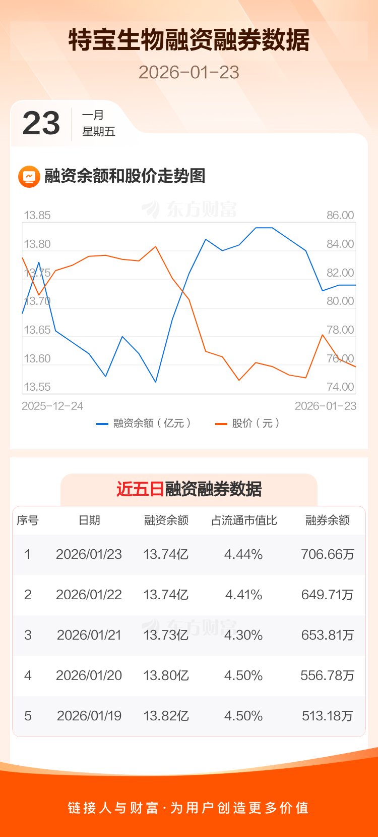 交易所最新数据显示,特宝生物于2026年1月23日获融资买入913.00万元,融资偿还894.90万元,当日融资净买入18.1万元。目前,该股融资余额13.74亿,占流通市值比例为4.44%。
