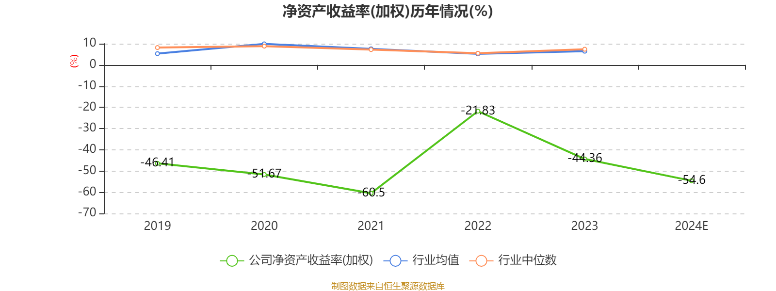 数据显示,2024年公司加权平均净资产收益率为-54.6%,较上年同期下降10.24个百分点。