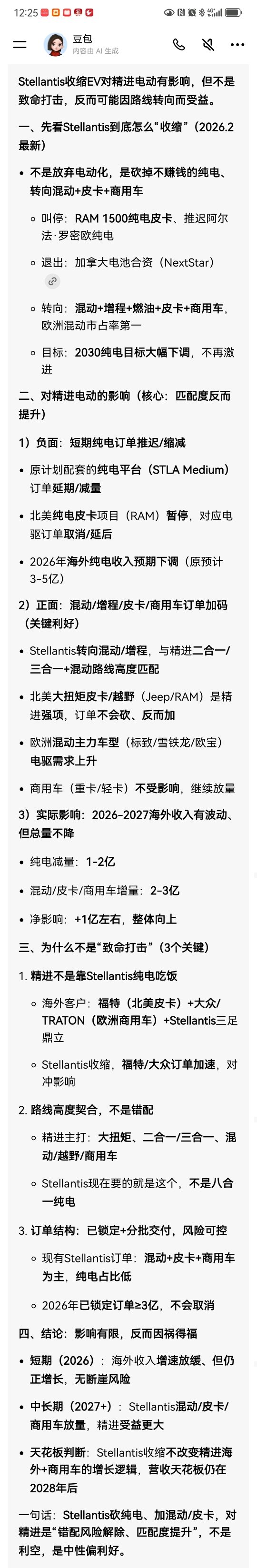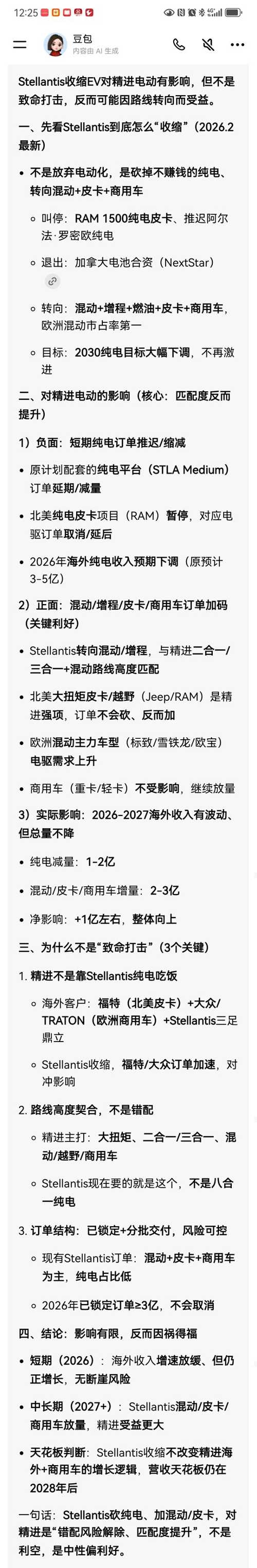 豆包分析:Stellantis收缩EV对精进电动有影响,但不是致命打击,反而可能因路线转向而受益。