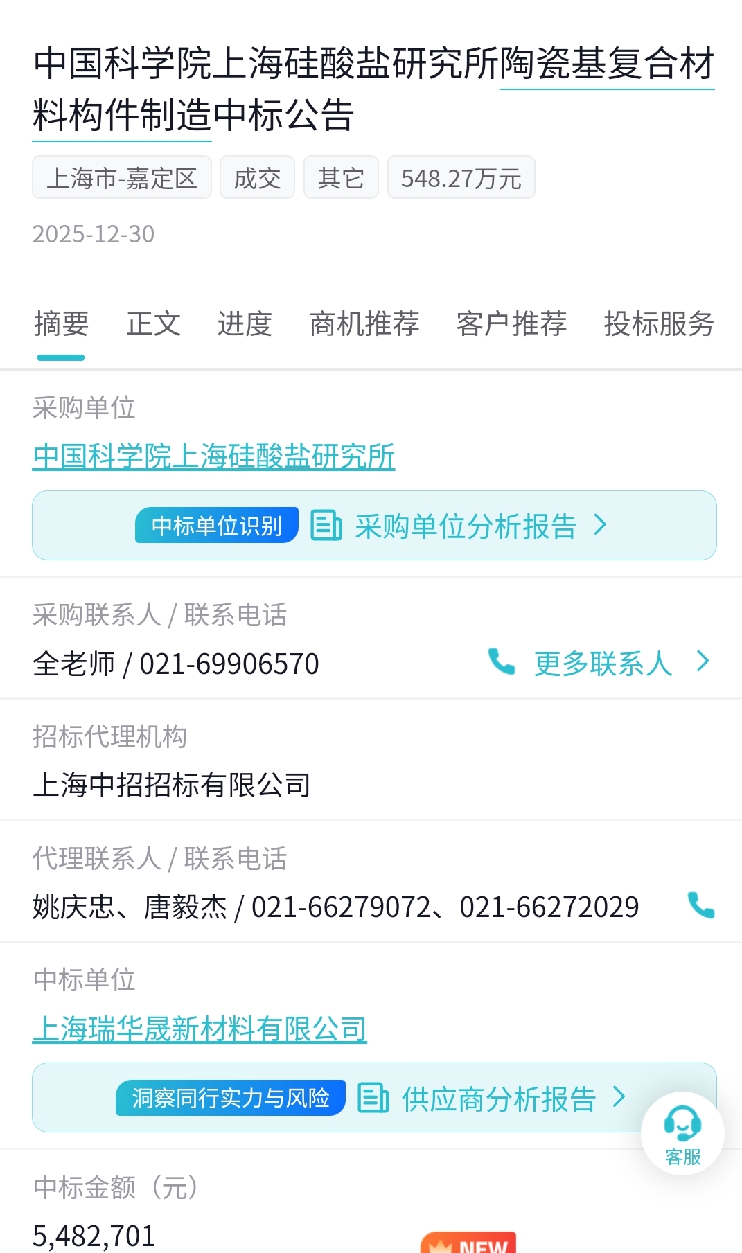 同时,值得注意的是,公司在2025年12月30日中标了中国科学院上海硅酸盐研究所的陶瓷基复合材料构件制造订单,共计548.27万!公司营收爆发已初现苗头!