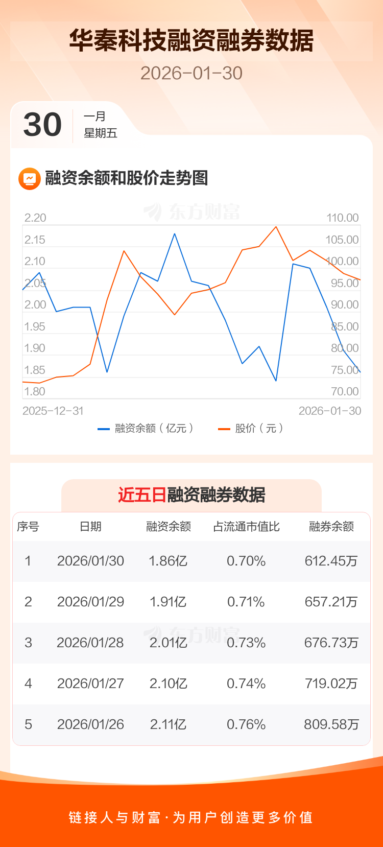 交易所最新数据显示,华秦科技于2026年1月30日获融资买入1889.74万元,融资偿还2346.06万元,当日融资净偿还456.32万元。目前,该股融资余额1.86亿,占流通市值比例为0.70%。