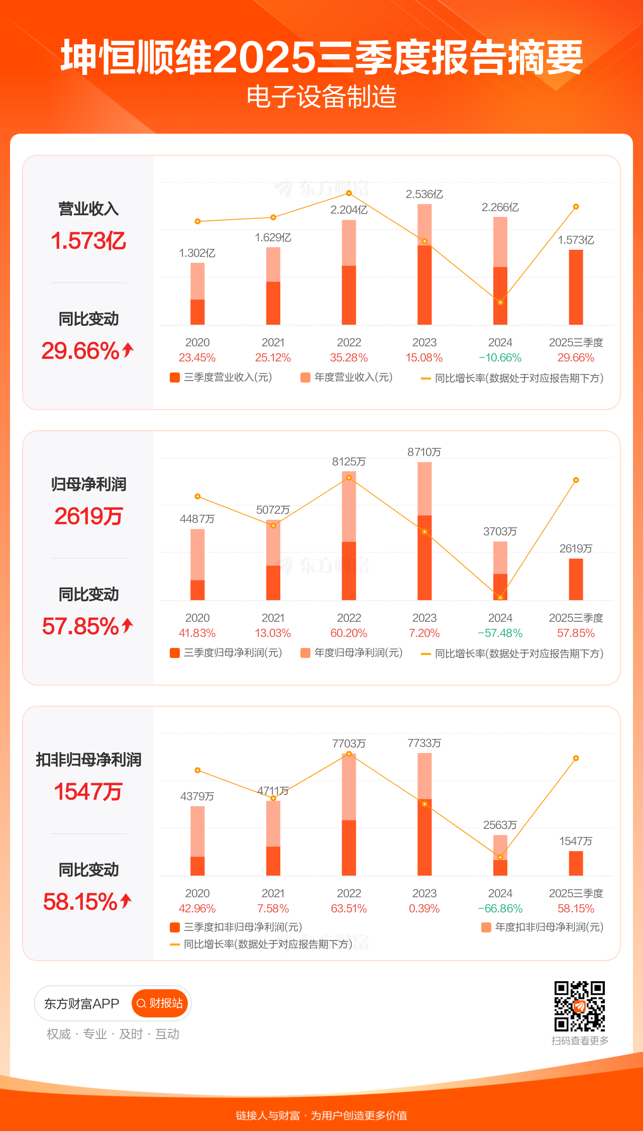 坤恒顺维10月29日发布2025年三季报显示,公司前三季实现营业收入1.57亿元,同比增长29.66%;归母净利润2618.98万元,同比增长57.85%;扣非归母净利润1547.38万元,同比增长58.15%。