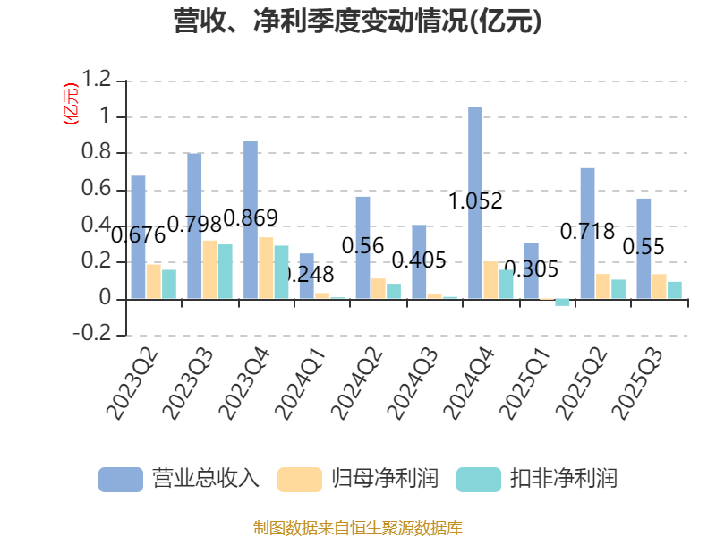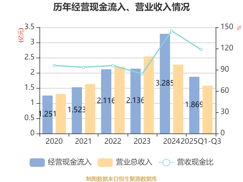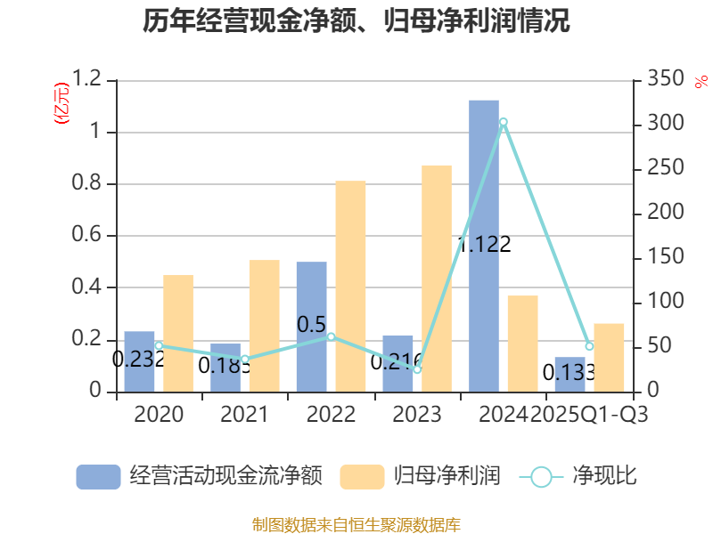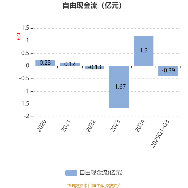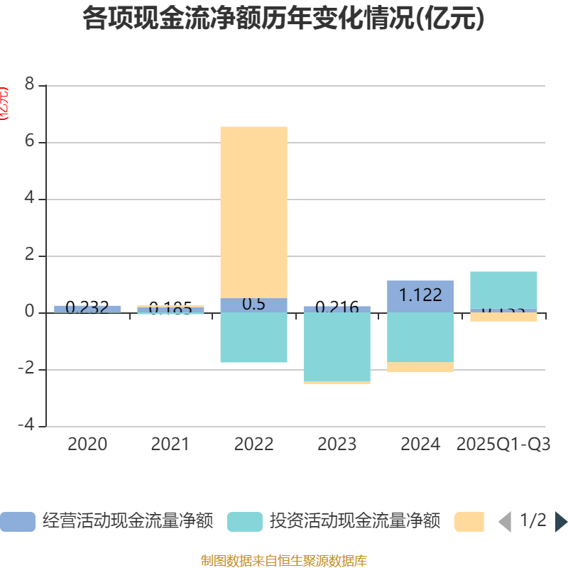 2025年前三季度,公司经营活动现金流净额为1333.08万元,同比下降32.7%;筹资活动现金流净额-3191.9万元,同比增加287.17万元;投资活动现金流净额1.3亿元,上年同期为-1.3亿元。
