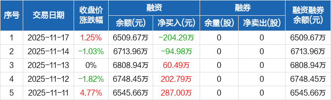 高铁电气:融资净偿还204.29万元,融资余额6509.67万元(11-17)