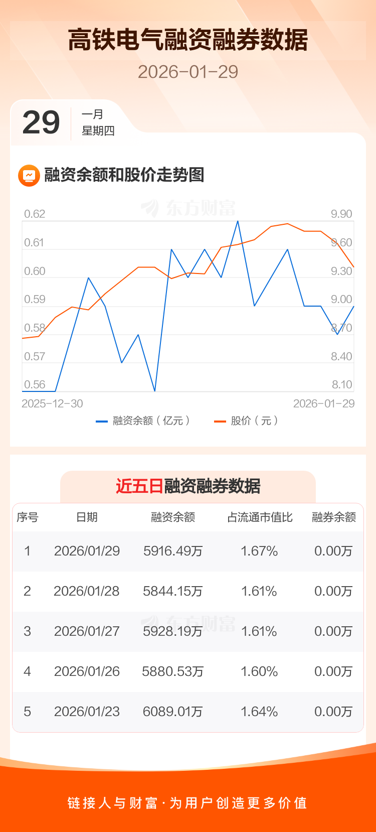 交易所最新数据显示,高铁电气于2026年1月29日获融资买入429.36万元,融资偿还357.02万元,当日融资净买入72.34万元。目前,该股融资余额5916.49万,占流通市值比例为1.67%。