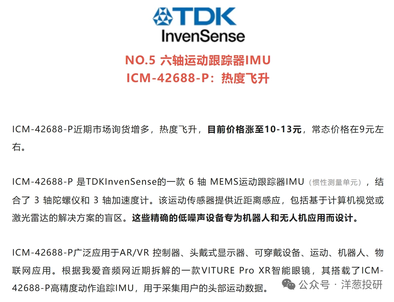 网传部分MEMS传感器开始涨价了。机器人赛道:优必选近期大涨5.76%,实现反包。消息面主要是:优必选智慧物流子公司UQI优奇与天奇自动化工程股份有限公司(下称“天奇股份”)正式签订采购合同。天奇股份将采购总价3000万元的优必选工业人形机器人Walker S系列,该笔采购将于2025年12月31日前完成交付。整体订单总订单金额已逼近4.3亿!特斯拉产业链,T链条核心个股今日表现较强,三花智控、拓普集团都有8个点左右的涨幅。消息面分析师认为特斯拉Q3有望缴出亮眼成绩。Wolfe 写道,“第三季有望成为强劲的一季,”指出美国与中国的需求均比预期更强劲。该机构估计交车量将达46.5万至47万辆,季增22%,按年增1%,“远高于市场普遍预期的44.5万辆。Wolfe 预计第三季每股盈余(EPS)将落在0.55至0.60美元,高于市场共识的0.49美元。所以,T链还是围绕核心个股,三花、拓普、荣泰、均胜这种核心票,包括争议很大的Tier 1 新泉,包括震裕,都是趋势非常好。国内相关的MEMS传感器,刚才查实了TDK旗下的下图这款料号,正如上述所描述。国内一些初创公司(如敏芯股份)可以做六轴的IMU,但还处在产品认证和入厂检测阶段。相信涨价的信息会促进这些企业加快研发进度,尽快量产,这其实体现了这个赛道的需求,消费、物联网端会持续看好。敏芯股份可在2026年4月,2025年报公布前持续重点关注。