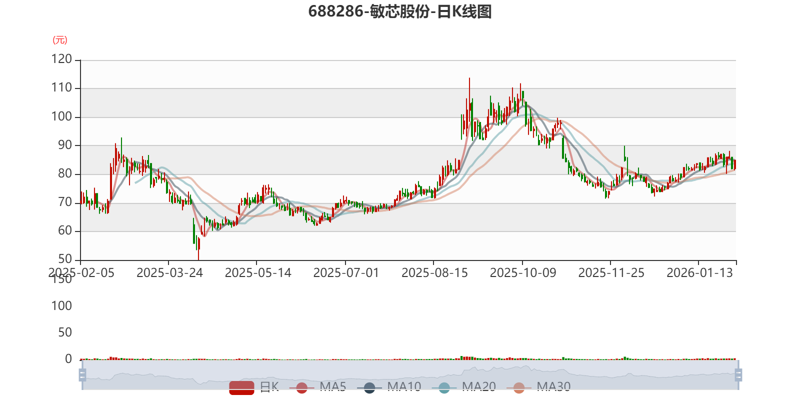 中证智能财讯敏芯股份(688286)1月30日晚间披露2025年度业绩预告,预计2025年实现营业收入5.8亿元至6.4亿元,同比增长14.68%-26.55%;归母净利润2800万元至4000万元,上年同期亏损3523.57万元;扣非净利润预计2300万元至3400万元,上年同期亏损3508.91万元。以1月30日收盘价计算,敏芯股份目前市盈率(TTM)约为119.01倍-170.02倍,市净率(LF)约4.44倍,市销率(TTM)约7.8倍。