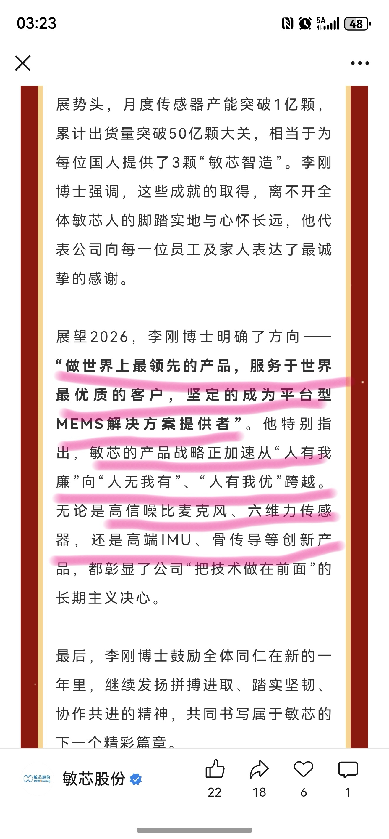 $敏芯股份(SH688286)$ 李刚对敏芯2026年的展望: