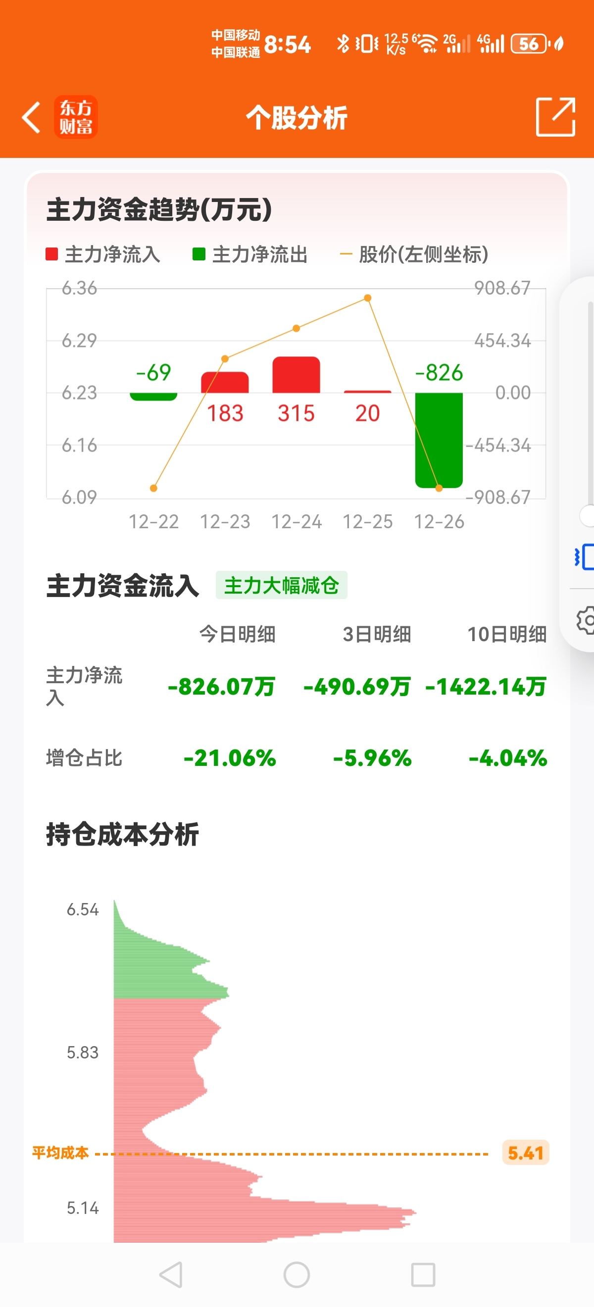东方财富显示主力持仓成本5.41元,也就是说主力一般洗盘不会击穿其持仓成本,如果