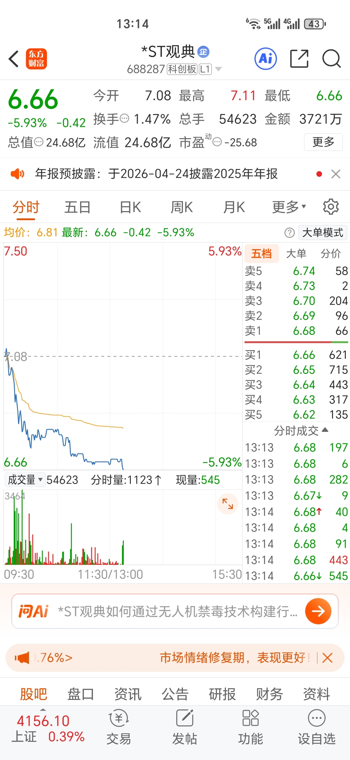 $*ST观典(SH688287)$ 观典防务666,弄了一年,还在低空飞行。失望了的666