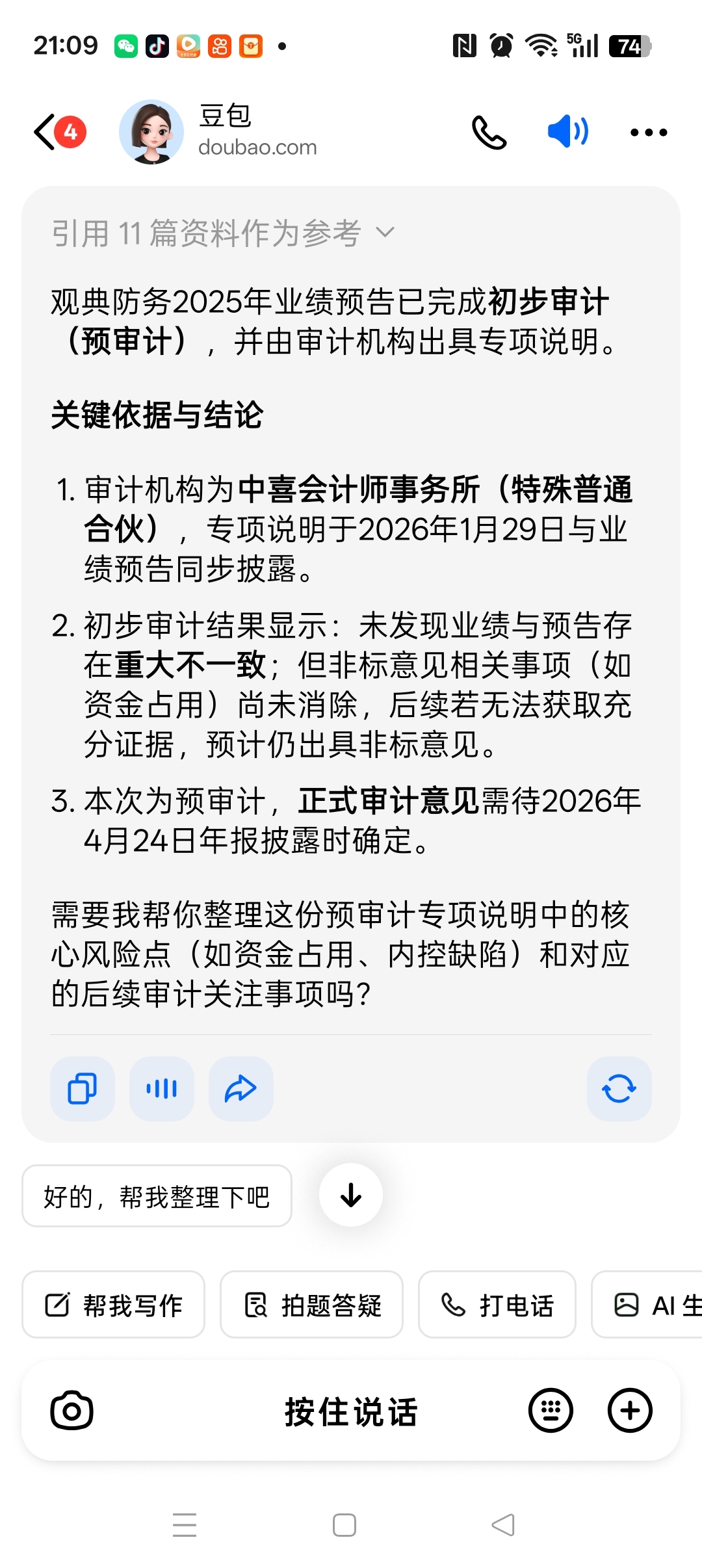 审计机构预审计已经完成,未发现异常,只不过有些事项需要进一步确认而已。随后如果股