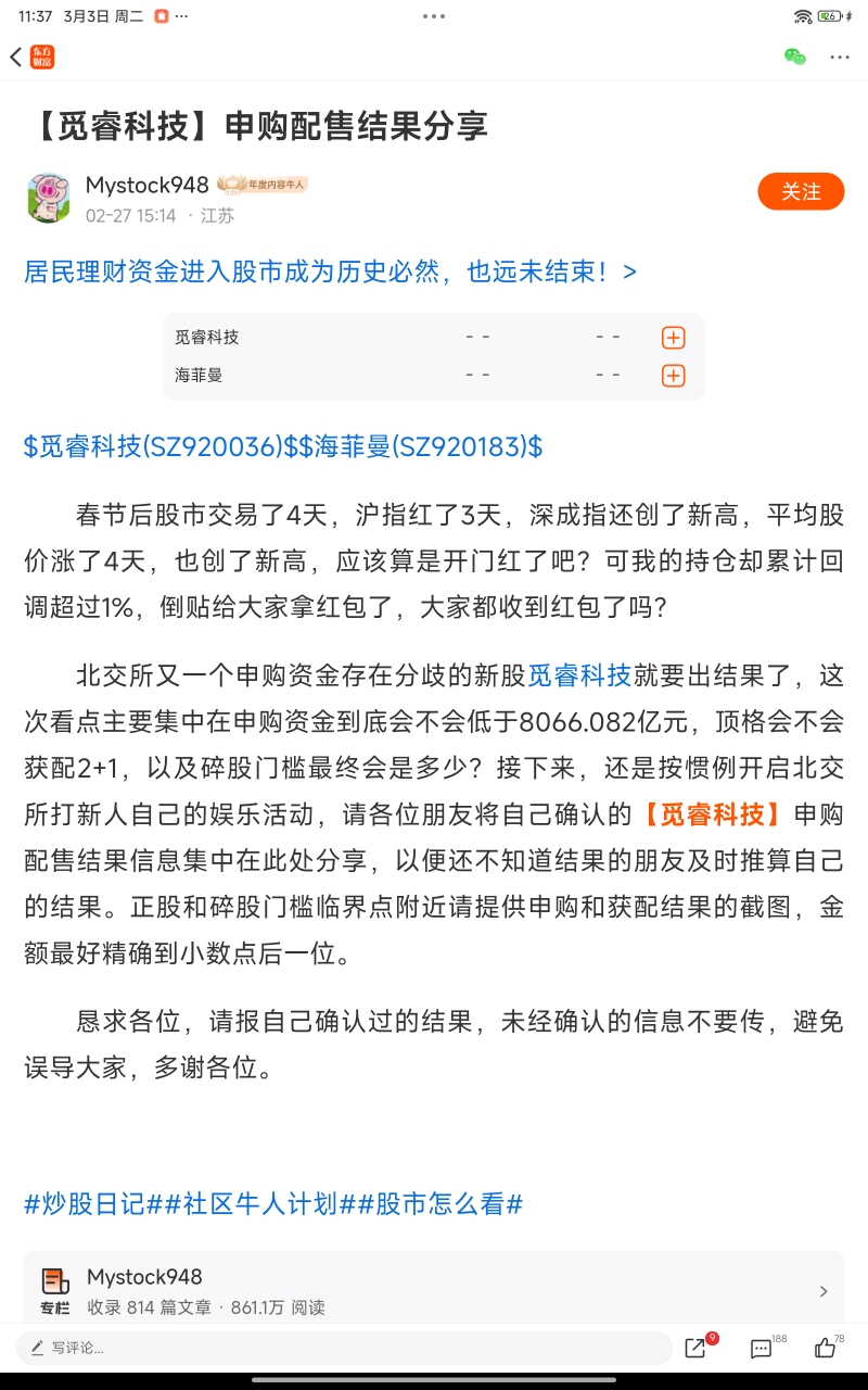 在北交所申购过程中,各个环节都有很多老师向投资者持供各种数据和资金分析,出结果的当晚,由来自江苏的财神(截图中的作者)于当天收集后供大家分享结果。在这里,我恳请大家在观典防务在未出结果之前,尽情发挥展示各之观点,百花齐放。谢谢大家