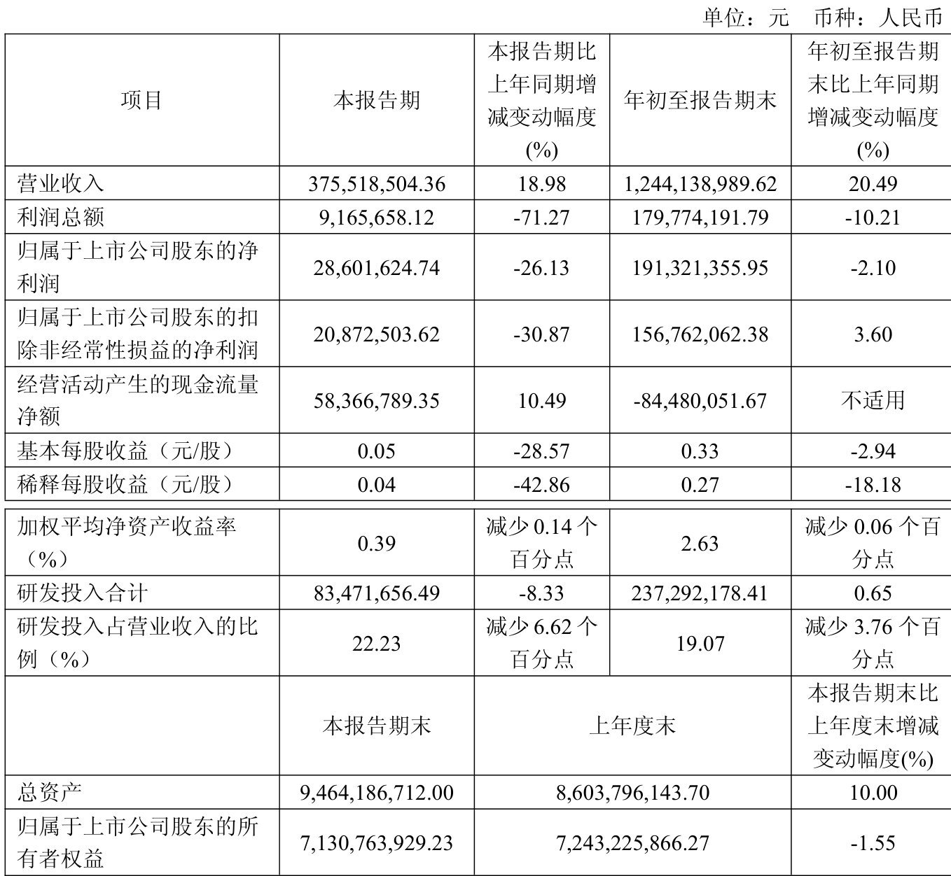中证智能财讯圣湘生物(688289)10月31日披露2025年第三季度报告。前三季度公司实现营业总收入12.44亿元,同比增长20.49%;归母净利润1.91亿元,同比下降2.10%;扣非净利润1.57亿元,同比增长3.60%;经营活动产生的现金流量净额为-8448.01万元,上年同期为-997.89万元;报告期内,圣湘生物基本每股收益为0.33元,加权平均净资产收益率为2.63%。