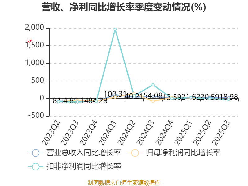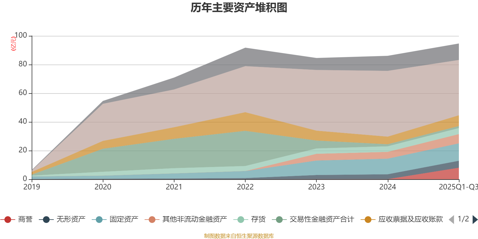 资产重大变化方面,截至2025年三季度末,公司货币资金较上年末减少15.84%,占公司总资产比重下降12.53个百分点;商誉较上年末增加10345.09%,占公司总资产比重上升8.37个百分点;应收票据及应收账款较上年末增加41.08%,占公司总资产比重上升1.74个百分点;其他非流动金融资产较上年末增加36.95%,占公司总资产比重上升1.34个百分点。