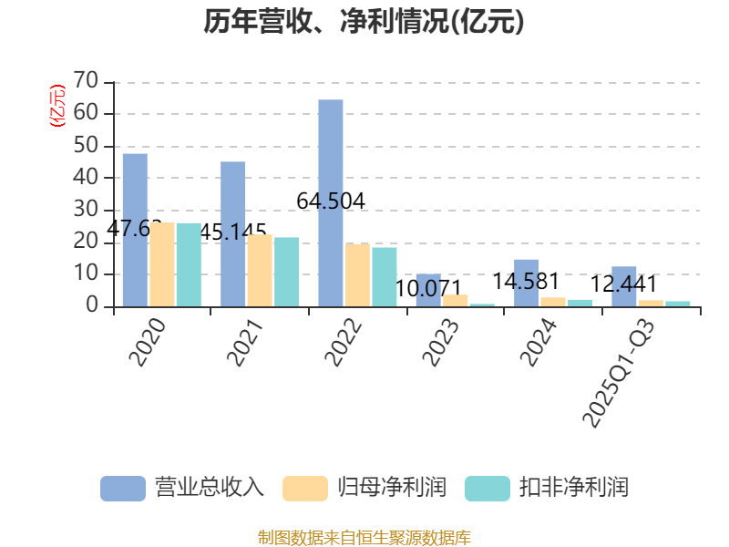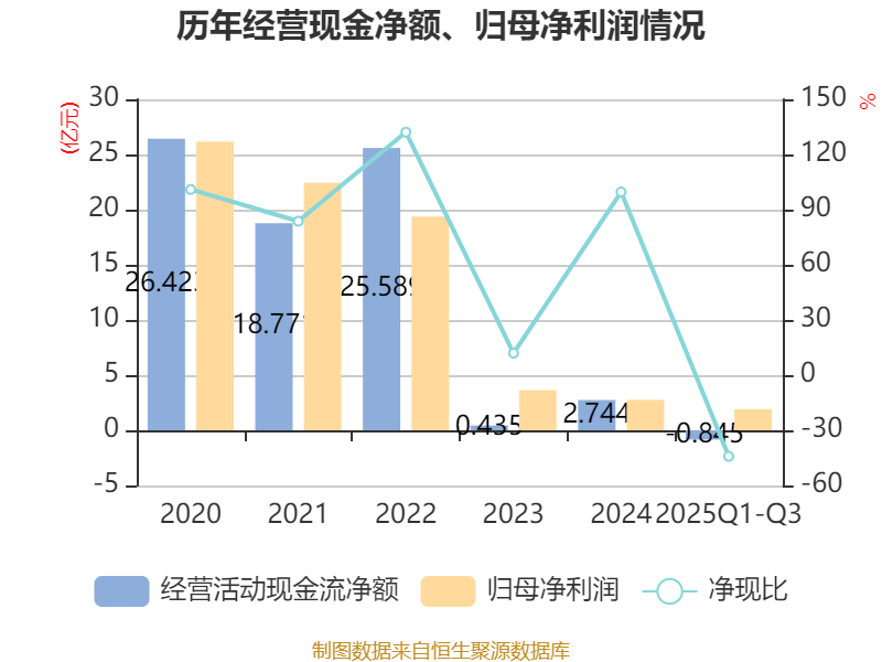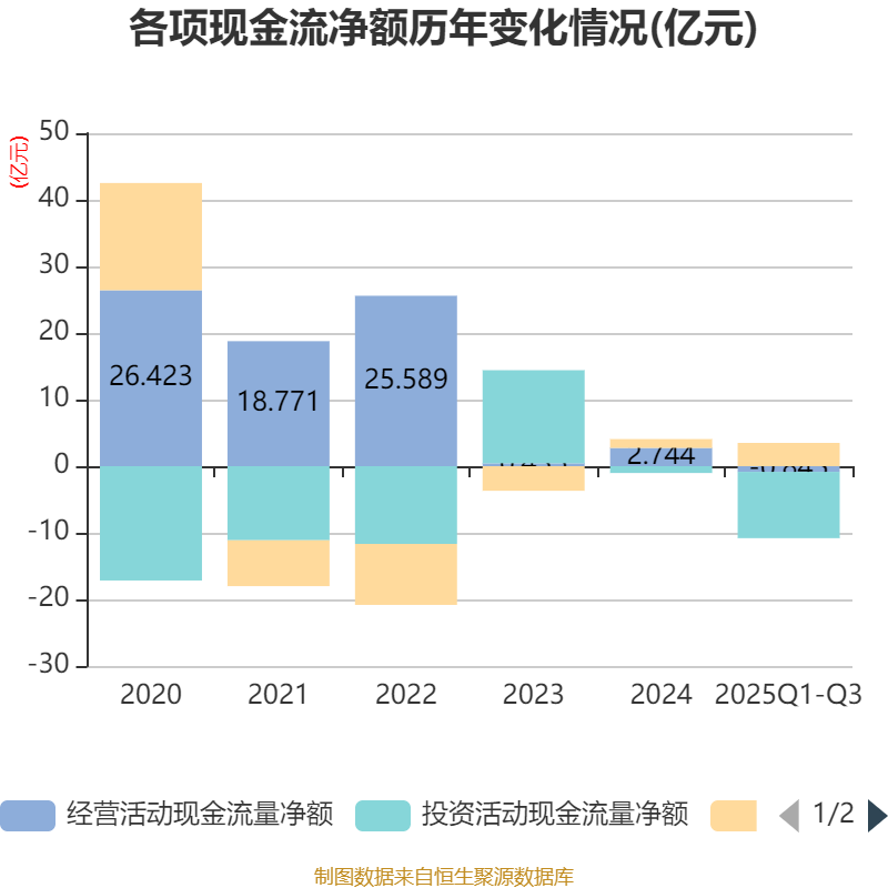 2025年前三季度,公司经营活动现金流净额为-8448.01万元,同比减少7450.12万元;筹资活动现金流净额3.5亿元,同比增加2.01亿元;投资活动现金流净额-9.96亿元,上年同期为2897.4万元。