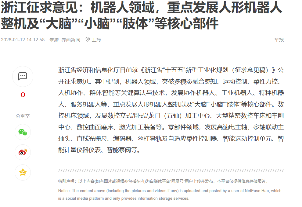 1月12日下午浙江省政府发布的 《浙江省十五五”新型工业化规划(征求意见稿》 释放出中国机器人产业史上最强省级信号!